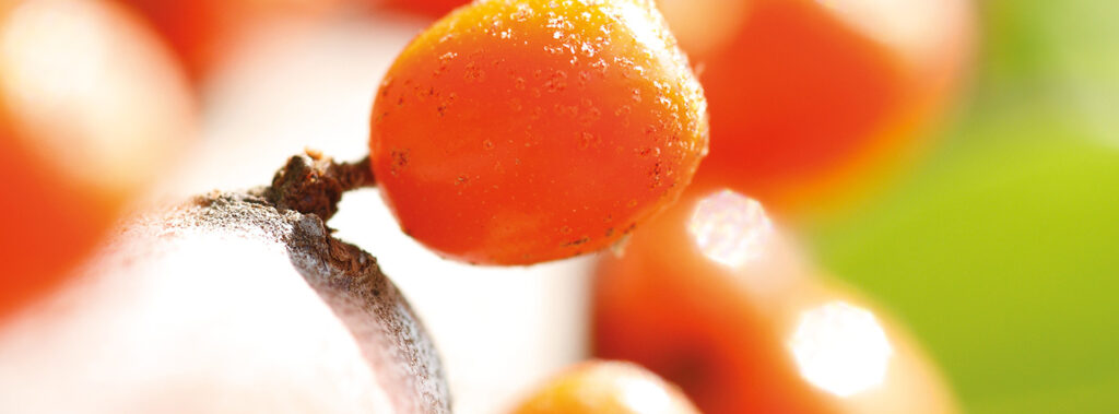 Resilience is the most obvious characteristic of sea buckthorn. The bright berries contain an exceptionally high content of vitamin C, but also contain Vitamin B12 (cobalamin), which is especially important for vegetarians. Particularly during the cold and low light season, our immune system benefits from the stored sunlight in the berries, which helps to revitalise the system’s self-regulation, easily absorbing natural biological vitamins. This, in turn, helps boost general energy levels and the immune system.
